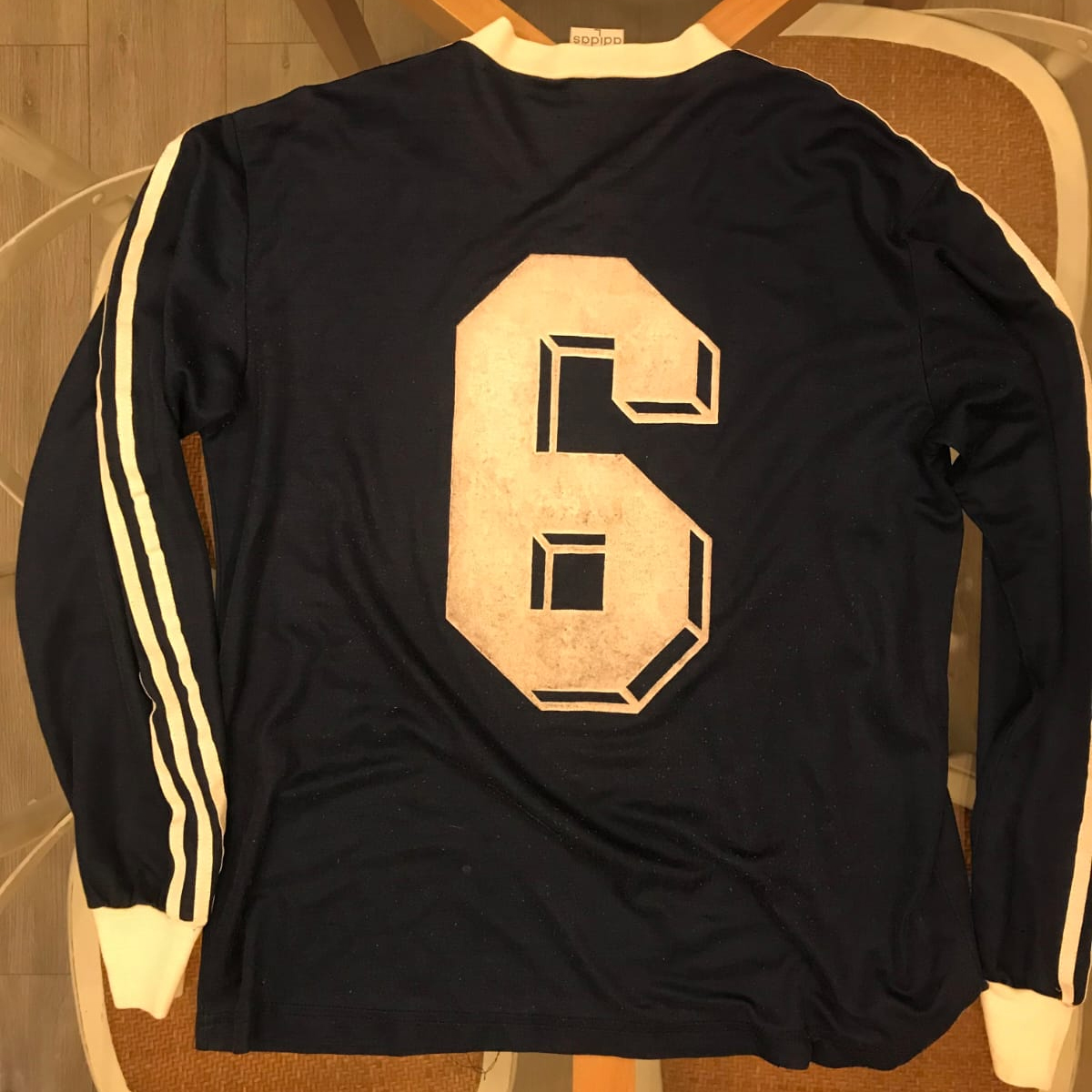 En felpa blanca el logo sponsor y dorsal 6.